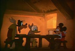 Да, именно новаторством! Замысел родился не только не на пустом месте, но – в тесной взаимосвязи с другими, официально признанными диснеевскими произведениями. Так, помимо сверчка Джимини прямиком из «Пиноккио» /1940/ должен был перекочевать подлый лис Честный Дж. Фулфеллоу, а Бонго рассматривался в качестве главного действующего лица продолжения «Дамбо» /1941/, то есть – своеобразным последователем слонёнка-уникума. Ещё важнее, на мой взгляд, перекличка с новеллой «Ученик чародея» из музыкально-анимационного шедевра, поскольку теперь Микки и его давние приятели выступают героями другого популярного сюжета. Когда храбрый мышонок (между прочим, в последний раз озвученный Уолтом лично) пытается применить опыт Кота в сапогах и, увидев мухобойку, просит великана превратиться в муху, номер не проходит! Незабываемо и финальное пришествие Вилли собственной персоной, заставляющее Эдгара Бергена пересмотреть представления о том, что есть действительность, а что – плод расшалившегося воображения.