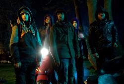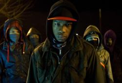 Сорокатрёхлетний Джо Корниш, сам росший на неспокойных улицах Южного Лондона, с блеском реализовал по-настоящему дерзкую идею. Смешение эстетики молодёжных комедий, густо замешанных на тревожных реалиях современных мегаполисов и полукриминальном быте местных парней, с темой агрессивного нападения инопланетян, готовых растерзать людей и заполонить всю Землю, безотказно вызывает мощный комический эффект. Когда Моузес, расправившись при помощи складного ножика с отвратительным на вид пришельцем, угрожает столь же легко разобраться с его сородичами в любых трансформациях и количествах, это ещё смешнее, чем бравады юных бандитов из города Бога, не боящихся и «красных бригад». Но действительность оказывается, как водится, куда кошмарнее и суровей, обрушивая на неискушённых подростков, любителей марихуаны, видеоигр, экранной фантастики и боевиков, большей частью – лишь мнящих себя взрослыми и самостоятельными личностями, такие испытания, что и кэмероновскому взводу спецназа и верховеновскому звёздному десанту не показалось бы мало. К радости киноманов герои сами проводят параллели с «культовыми» фильмами2, а Ник Фрост, с изрядной долей сарказма изобразивший содержателя теплицы, где выращивается конопля, который взирает на происходящее совершенно флегматично, даже предстаёт в футболке, что носил его Рон при встрече с Полом, развязным гостем из космоса. Любопытно и то, что роль медсестры, поневоле втягивающейся в жизнь района, исполнила Джоди Уайттэкер – Беверли из двух лент о школе Сент-Триниан. Наконец, самые наблюдательная и проницательная часть аудитории, признав3 за Корнишем право влиться (вслед за Эдгаром Райтом) в число кинематографистов, формирующих лицо современного британского юмора, отметят ещё одну любопытную особенность. Поместив события в знаменательный контекст – в так называемую Ночь костров (вот откуда у парней столько петард и фейерверков!), авторы придали локальному инциденту поистине историческое измерение. Причём – в пику Джеймсу МакТигу – не стали косвенно одобрять деяния анархиста-заговорщика Гая Фокса, а, наоборот, показали, что и нынешняя английская молодёжь, надежда и опора страны, готова в ключевой момент встать на защиту Соединённого Королевства. Чужие на районе будут уничтожены!